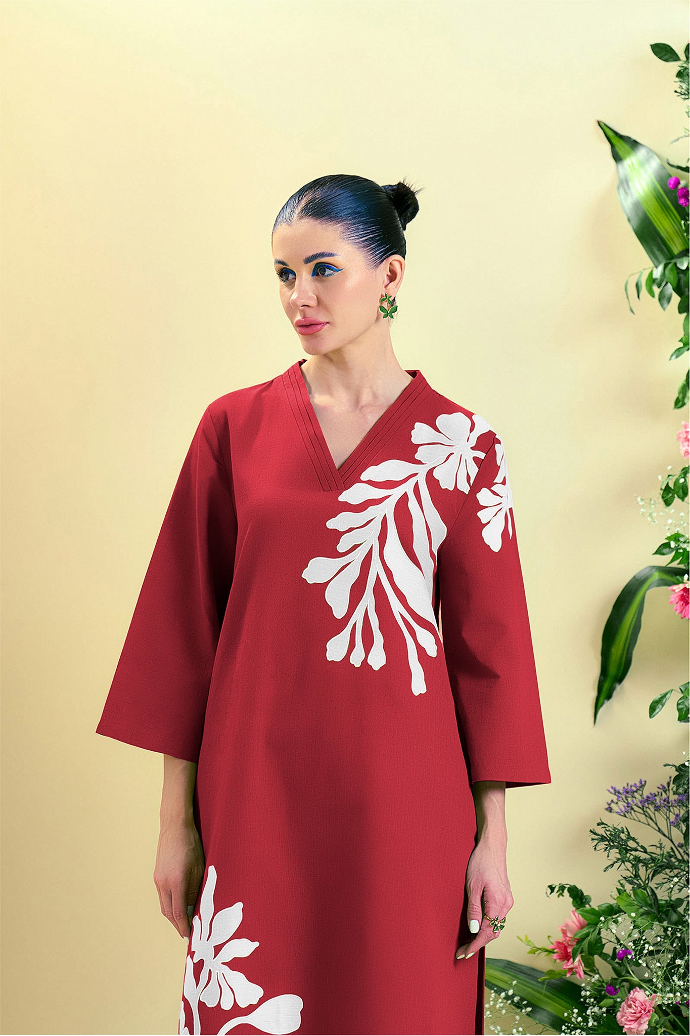 Elegant and earthy, the long kurta set features a pleated V-neckline, enhanced with intricate embroidery and Chanderi silk appliqué work for a touch of artisanal charm. Paired with a straight-fit pant that mirrors the kurta's embroidery and appliqué detailing, this set brings comfort and sophistication together effortlessly.