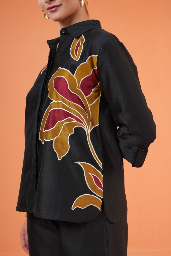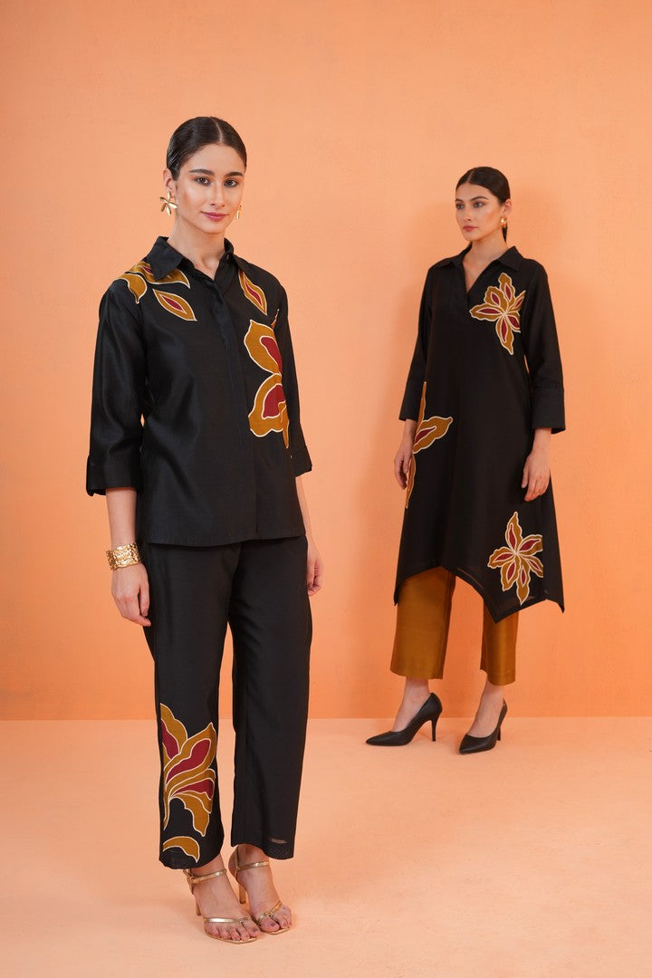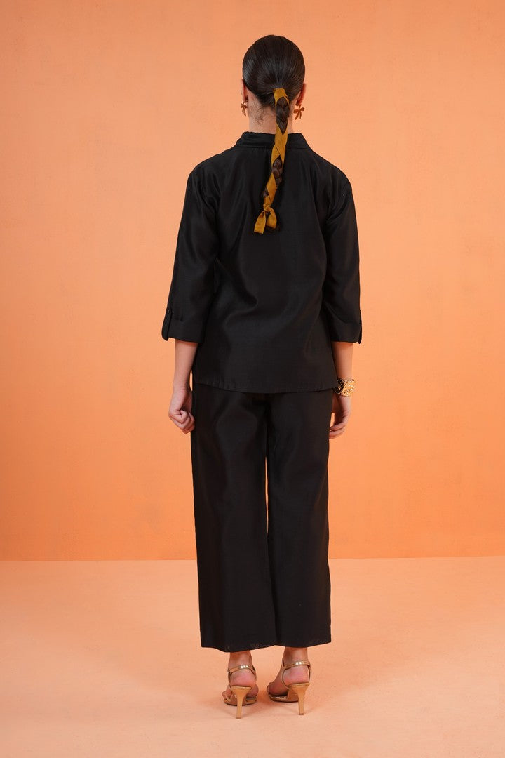 Black Chanderi Silk Co-ord Set with intricate Resham Embroidery and Appliqué work paired with coordinated Pants.