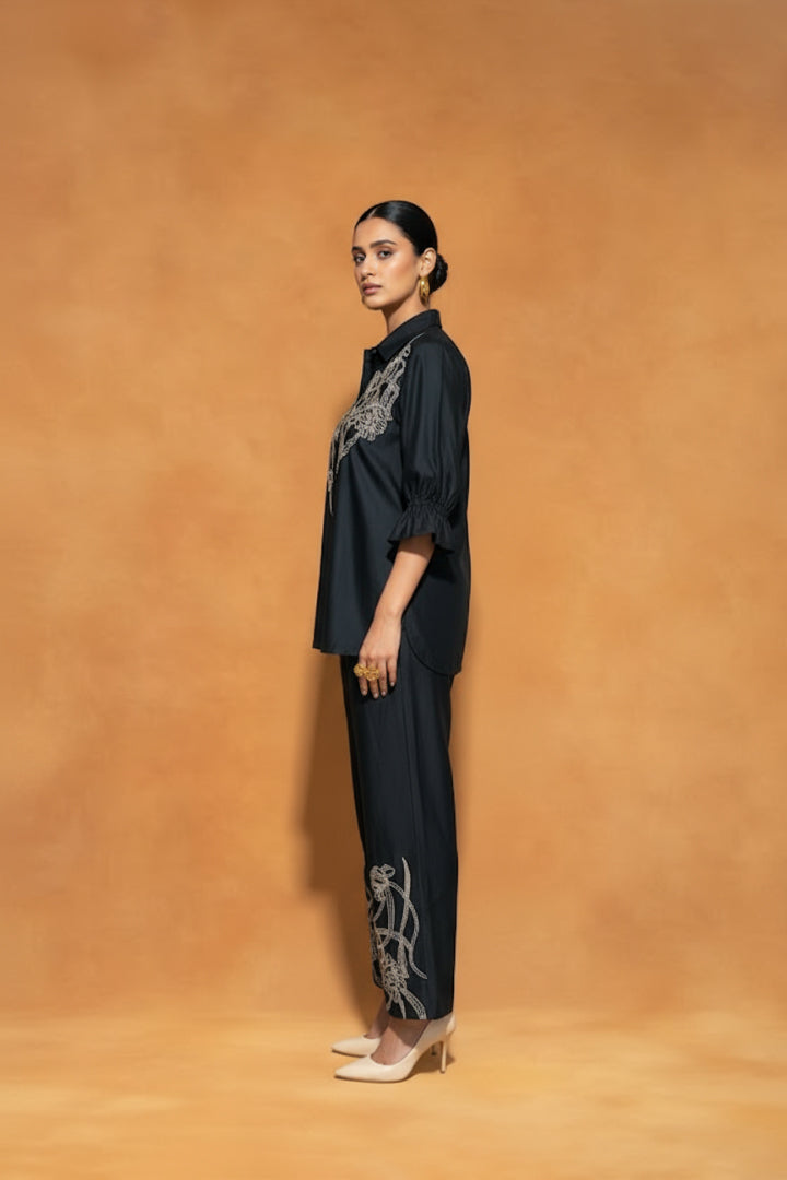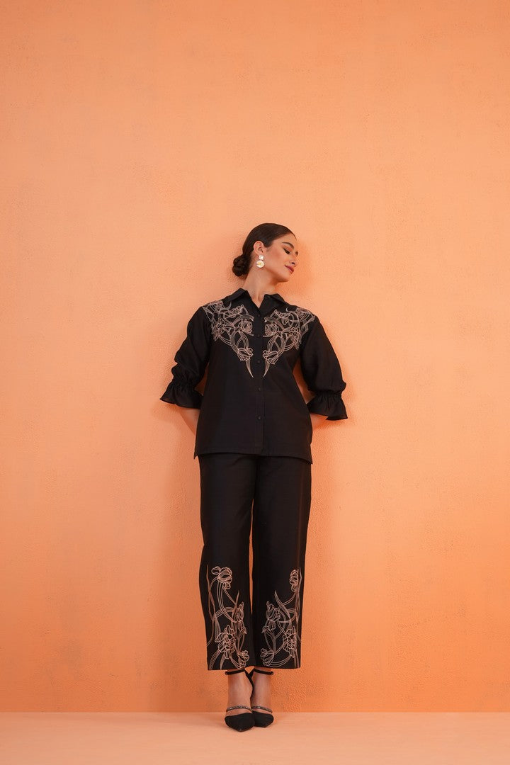 Black Chanderi Silk Co-ord Set highlighted with contrast Resham Thread Embroidery, styled with intricately Embroidered Pants.