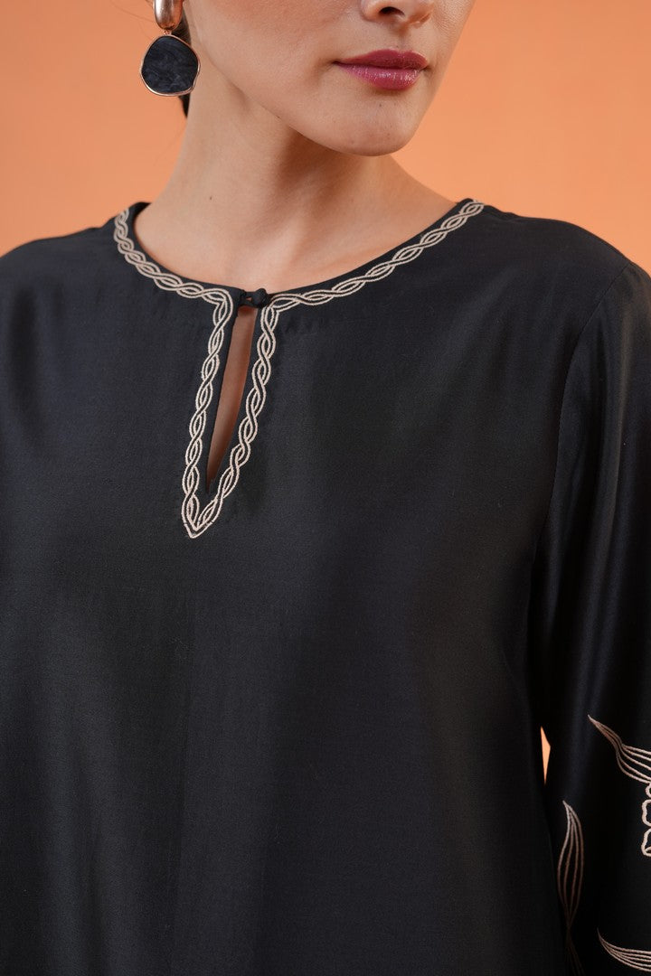 Black Chanderi Silk Kurta set accentuated with contrast Resham Embroidery and paired with intricately Embroidered Pants.