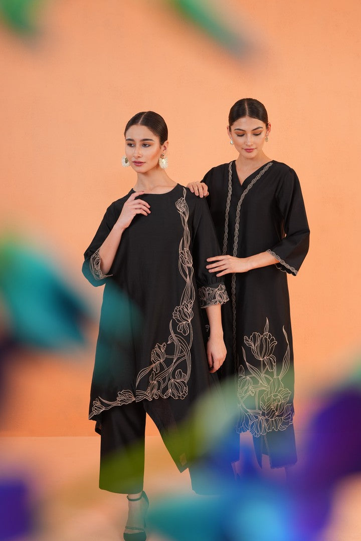 Black Chanderi Silk Asymmetrical Tunic Set, accentuated with Contrast Resham Embroidery and styled with Coordinated Pants.
