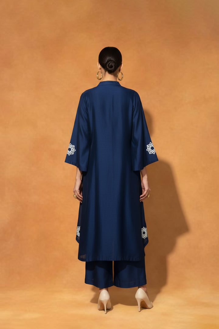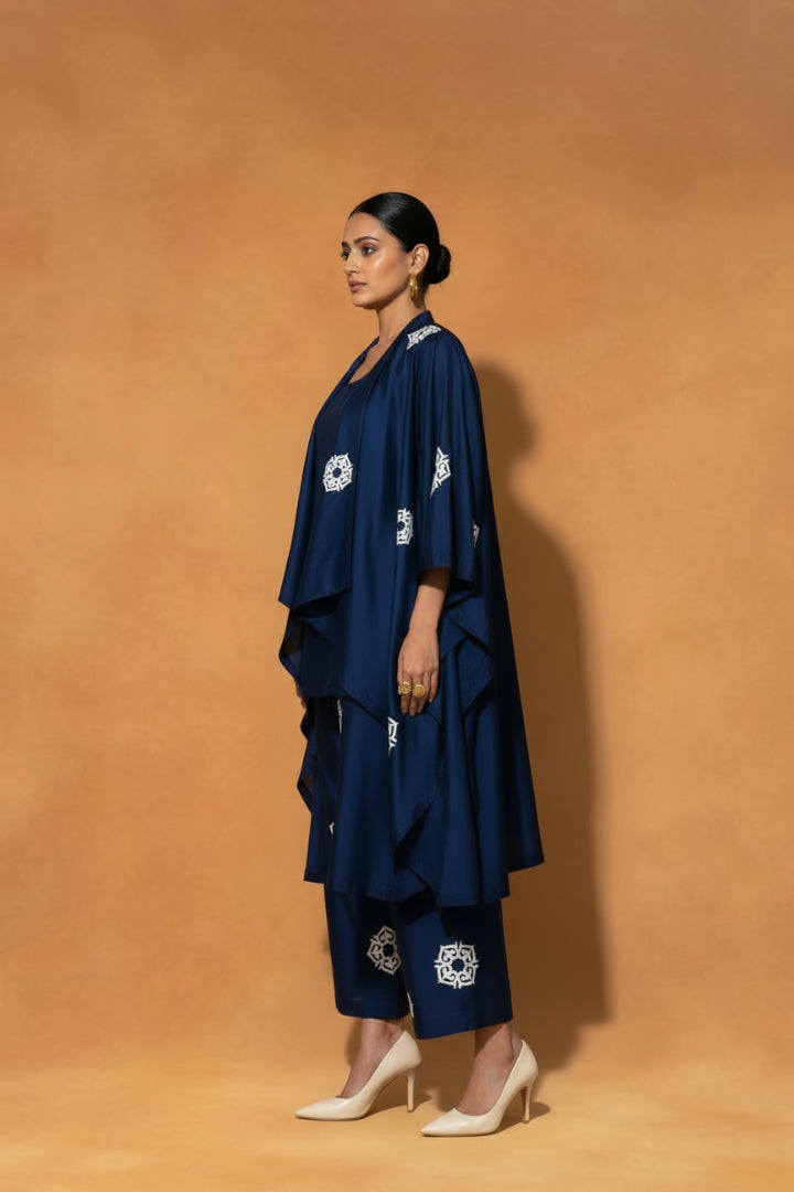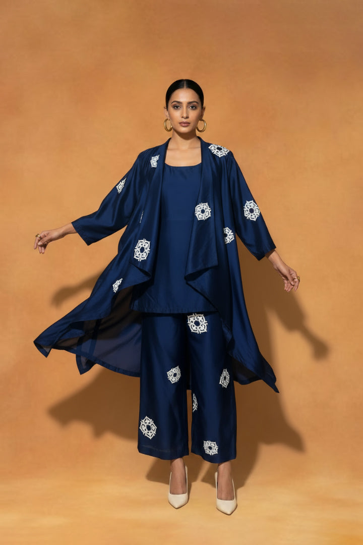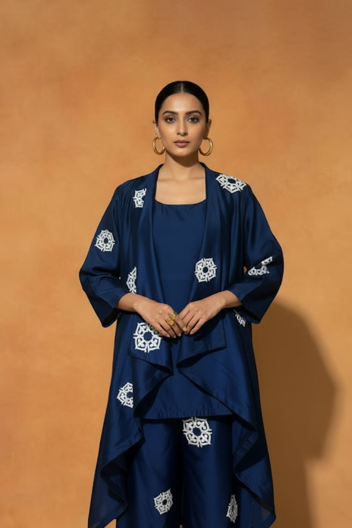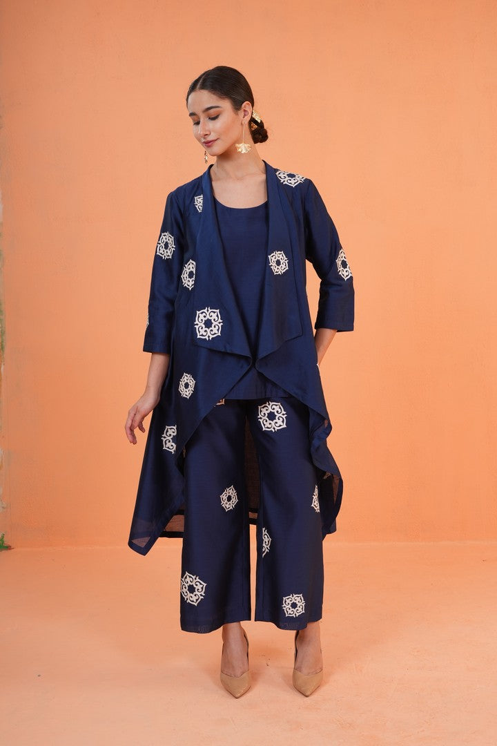Blue Chanderi Silk 3 Pcs Set, featuring a Waterfall Resham Embroidered Jacket, a sleek sleeveless Inner Top, and tailored Pants.
