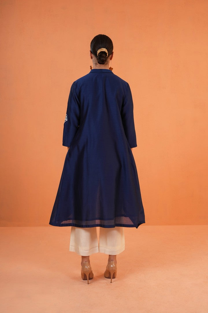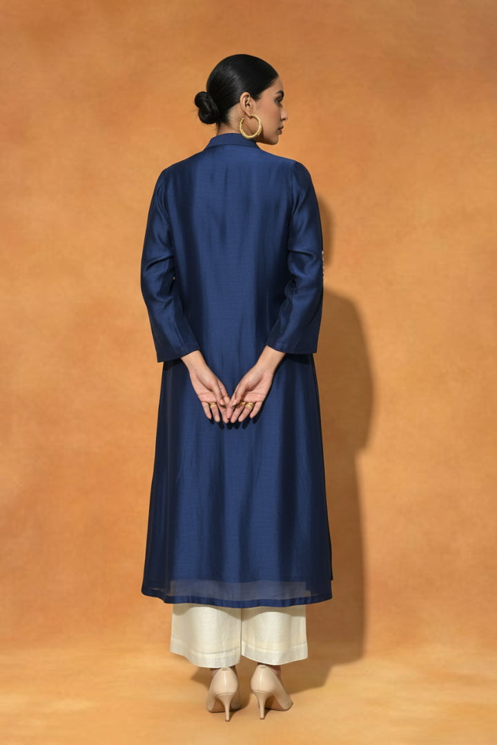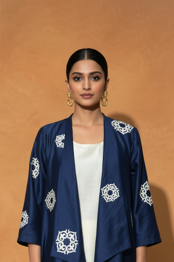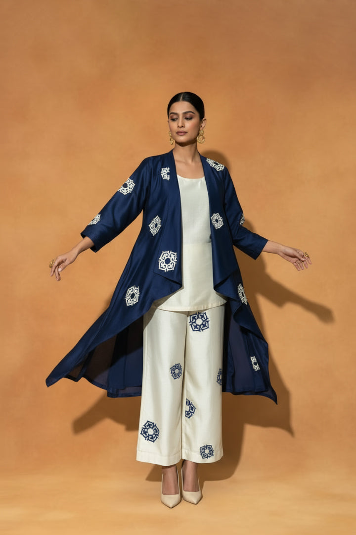 Blue and Ivory Chanderi Silk 3 Pcs Set, featuring a Waterfall Resham Embroidered Jacket, a sleek sleeveless Inner Top, and tailored Pants.