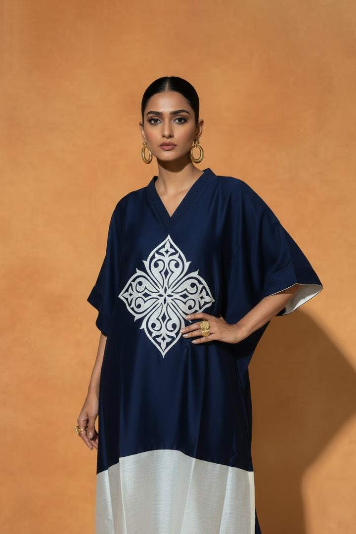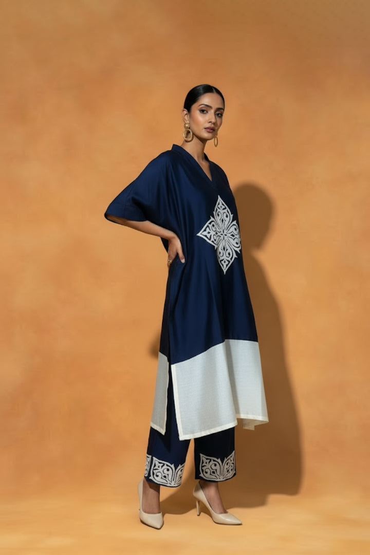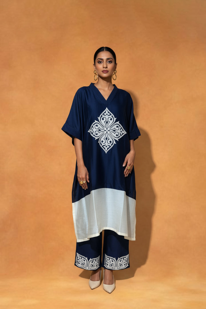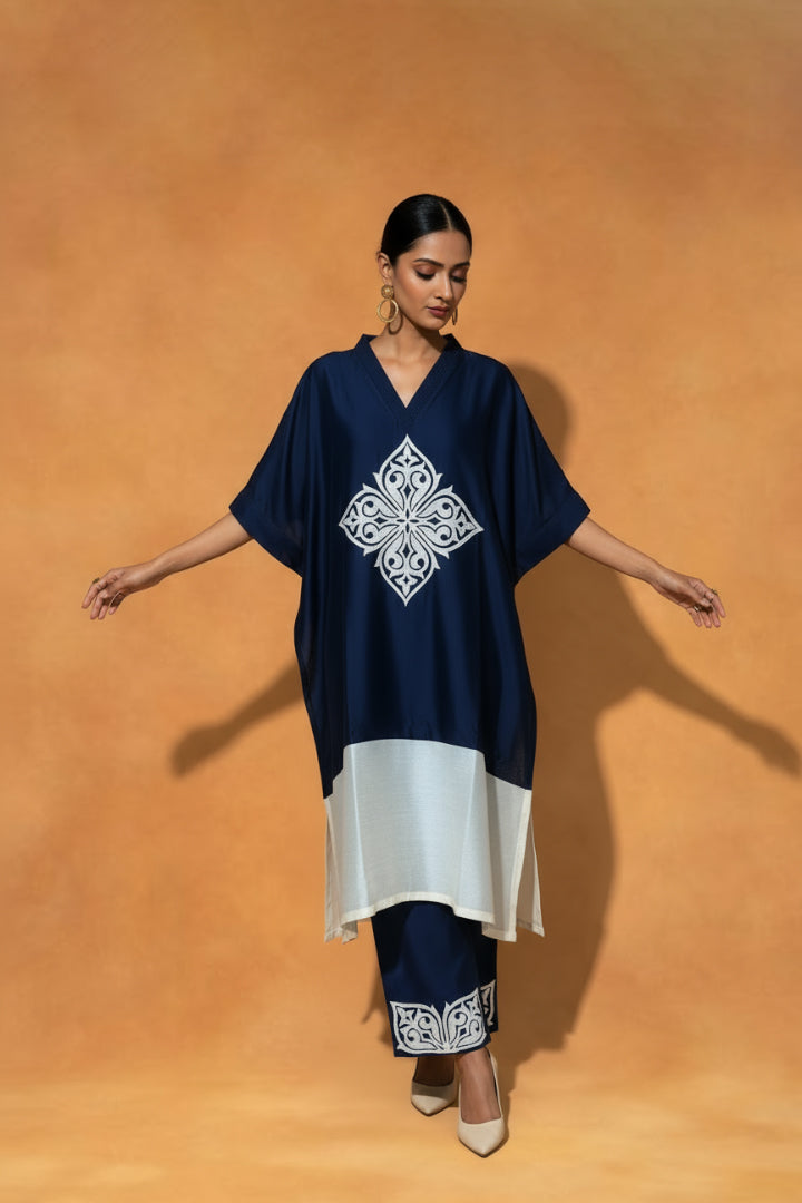 Blue and Ivory Chanderi Silk Kaftan-Styled Kurta Set, embellished with intricate appliqué and Resham Embroidery with coordinated Pants featuring appliqué detailing.