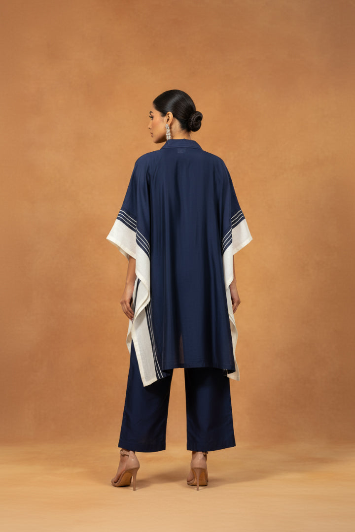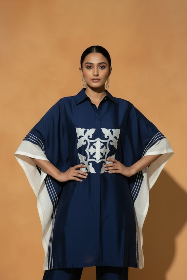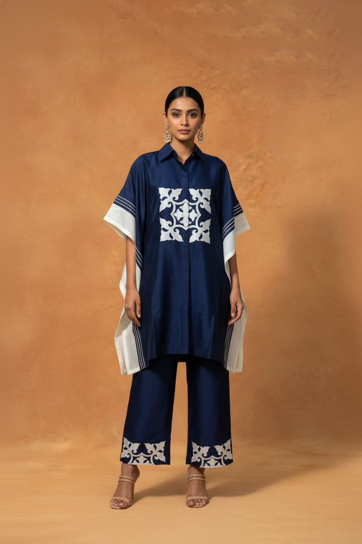 Blue and Ivory Chanderi Silk Kaftan-Styled Tunic Set, with intricate Appliqué and Resham Embroidery paired with Coordinated Pants.
