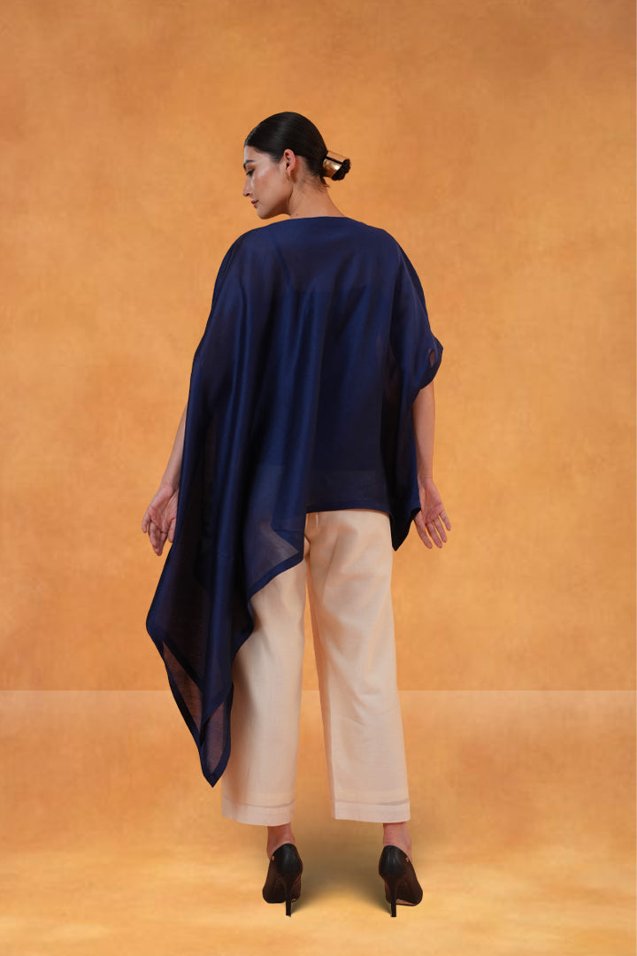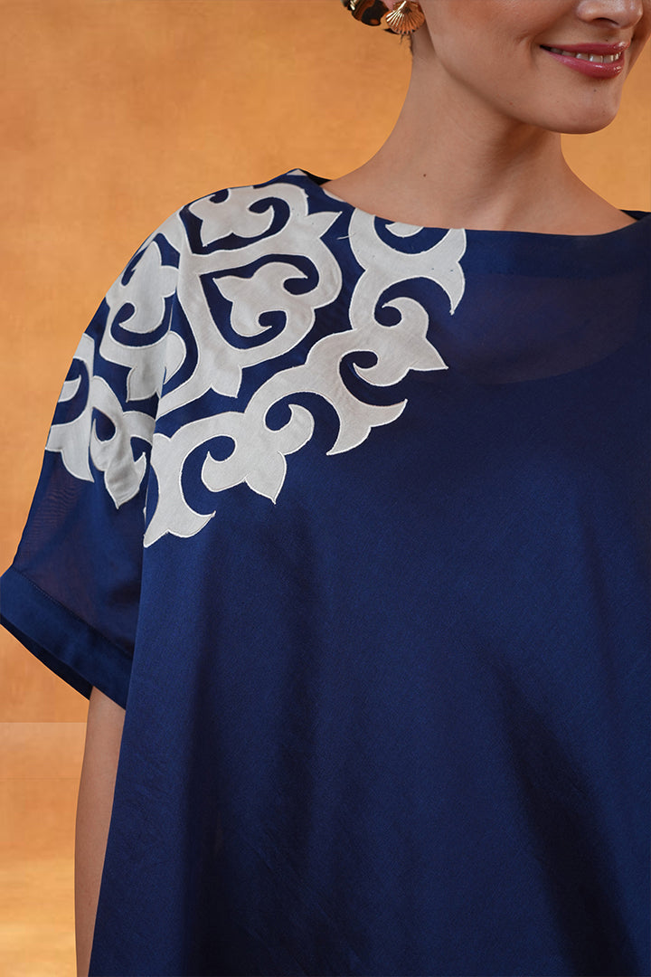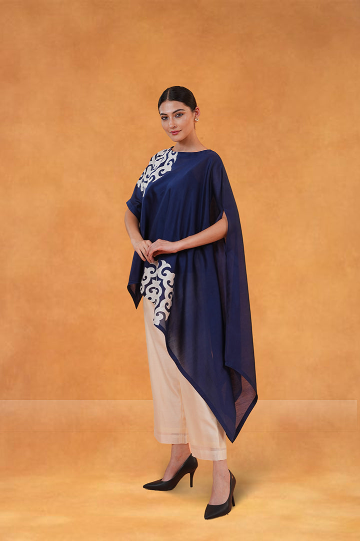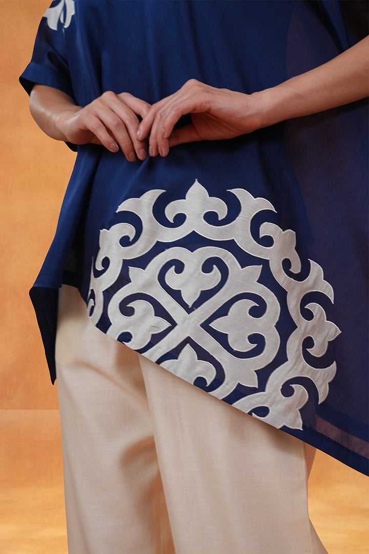 Blue Chanderi Silk Asymmetrical Kaftan Tunic, embellished with intricate Appliqué and Delicate Embroidery, paired with Contrast Ivory Pants.