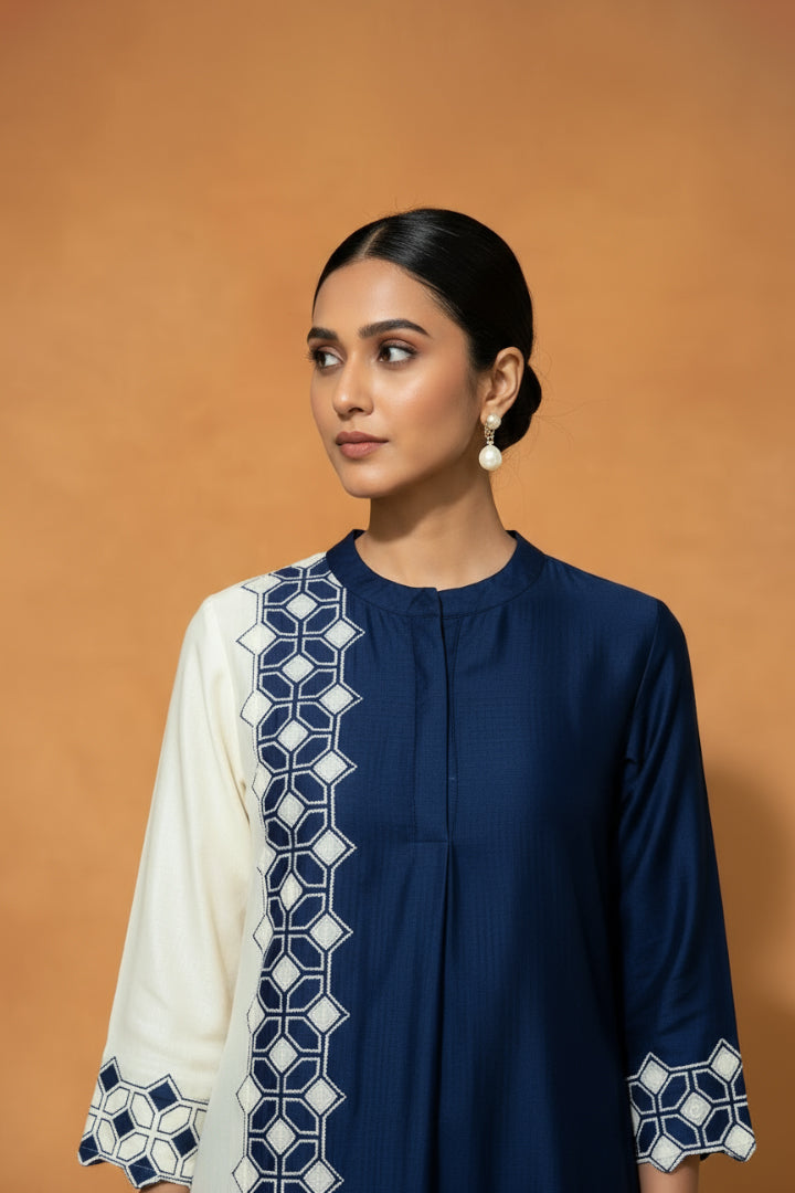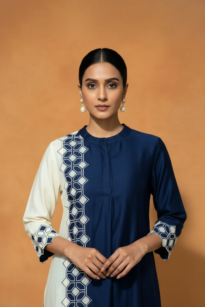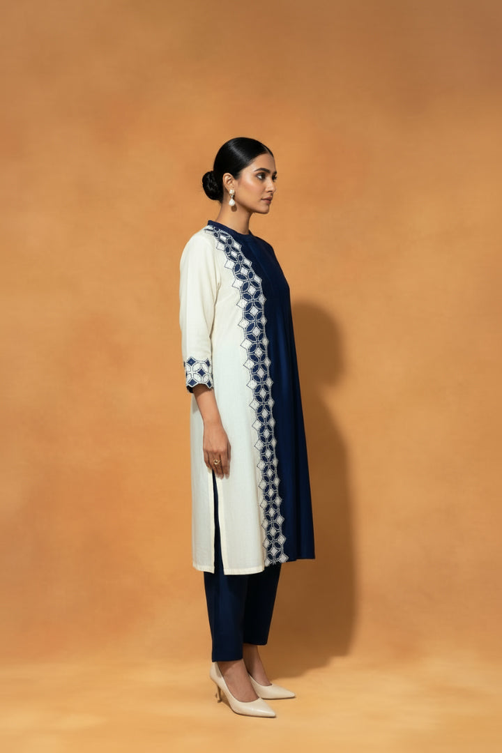Blue and Ivory Chanderi Silk Kurta Set in Dual colour, with Resham embroidery and Intricate Applique and Cutwork and styled with Coordinated Pants.