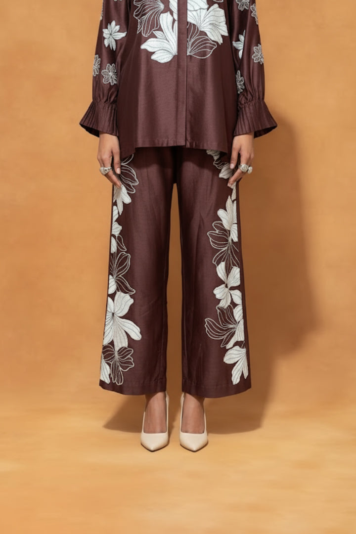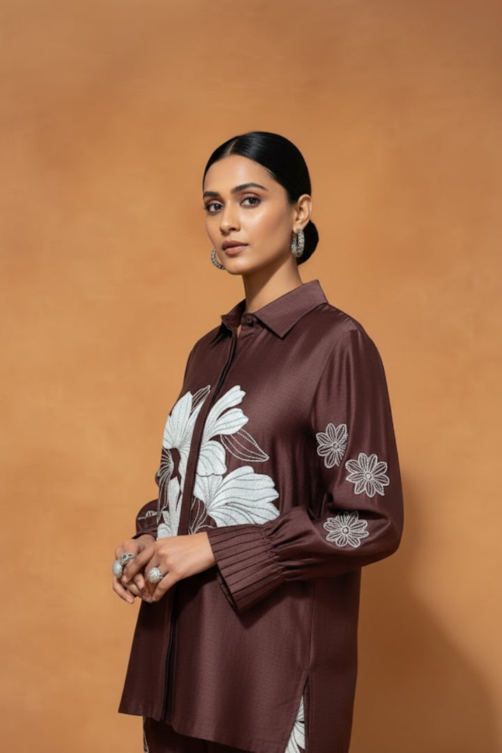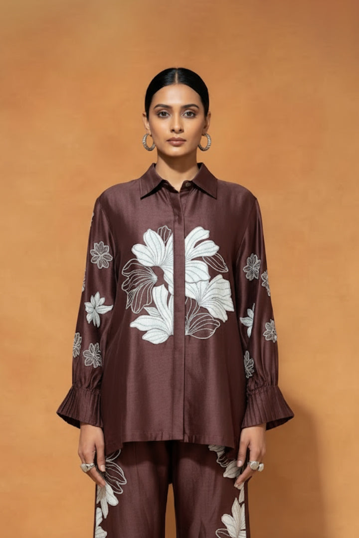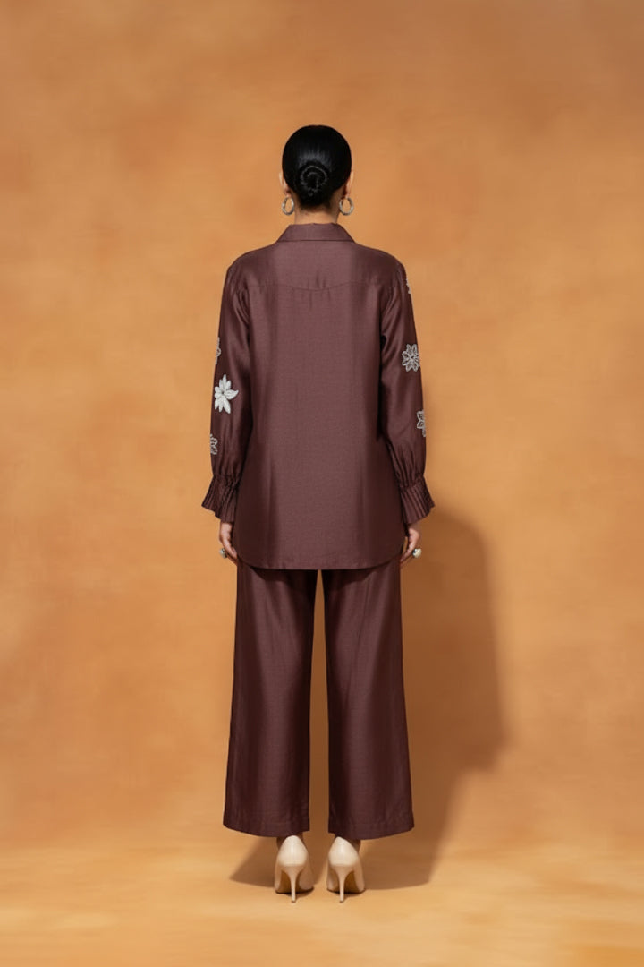 Brown Chanderi Silk Co-ord Set with contrast Appliqué and Intricate Resham Embroidery, paired with Embroidered Pants.