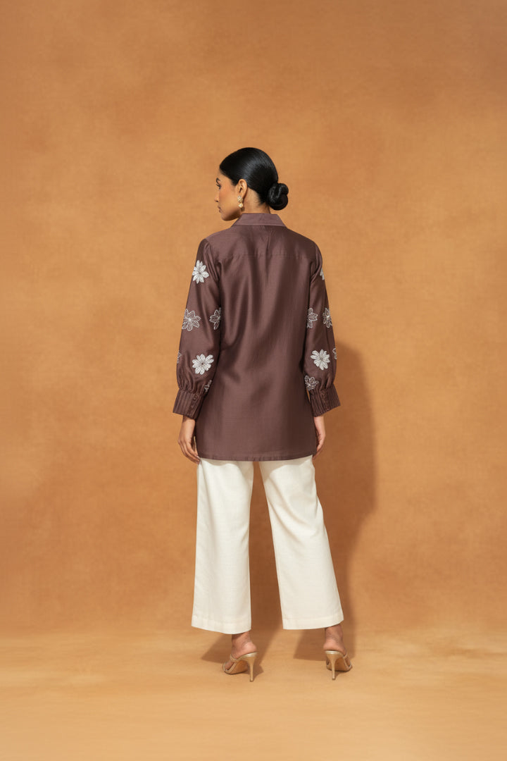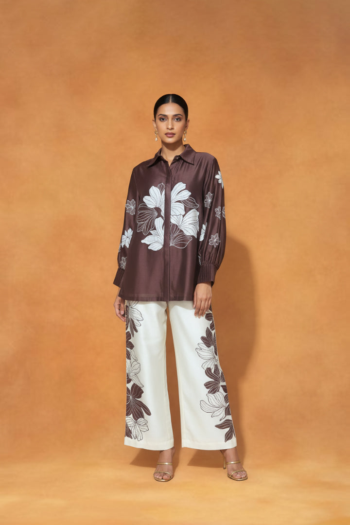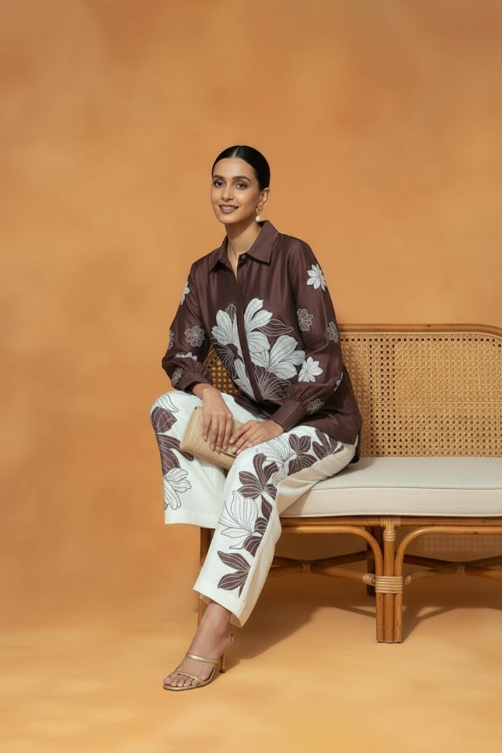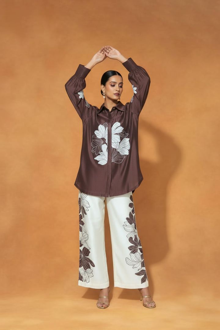 Brown - Ivory Chanderi Silk Co-ord Set with contrast Appliqué and Intricate Resham Embroidery, paired with Embroidered Pants.