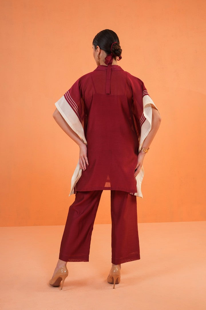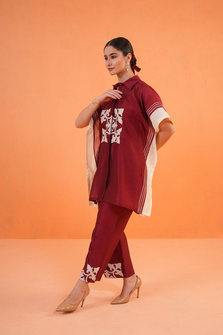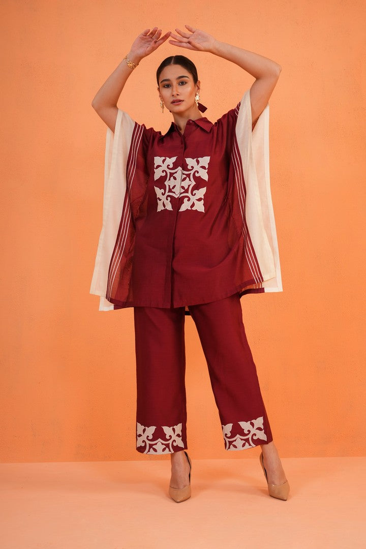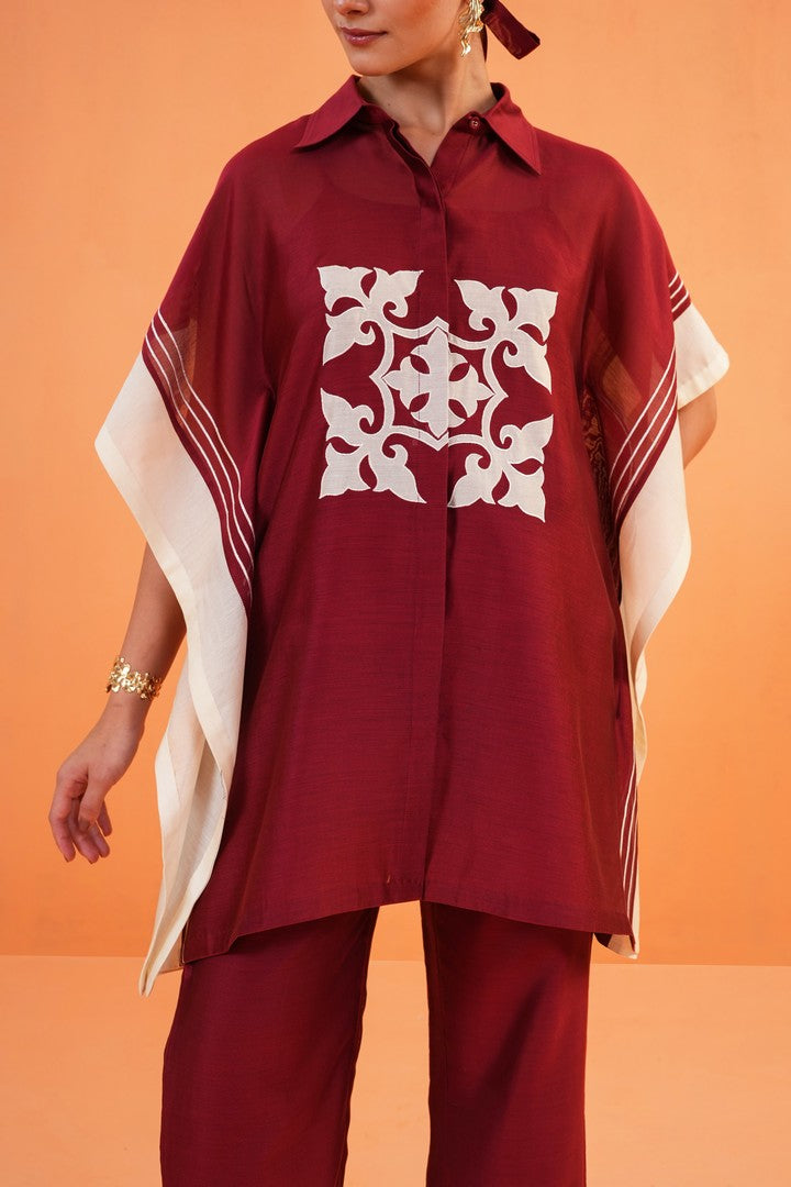Maroon and Ivory Chanderi Silk Kaftan-Styled Tunic Set, with intricate Appliqué and Resham Embroidery paired with Coordinated Pants.