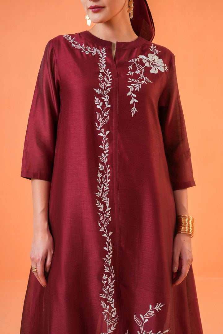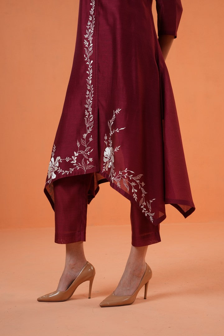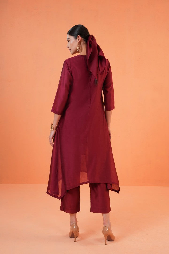 Maroon Asymmetrical Chanderi Silk Kurta Set with Intricate Resham Thread Embroidery, styled with coordinated Pants for graceful versatility.