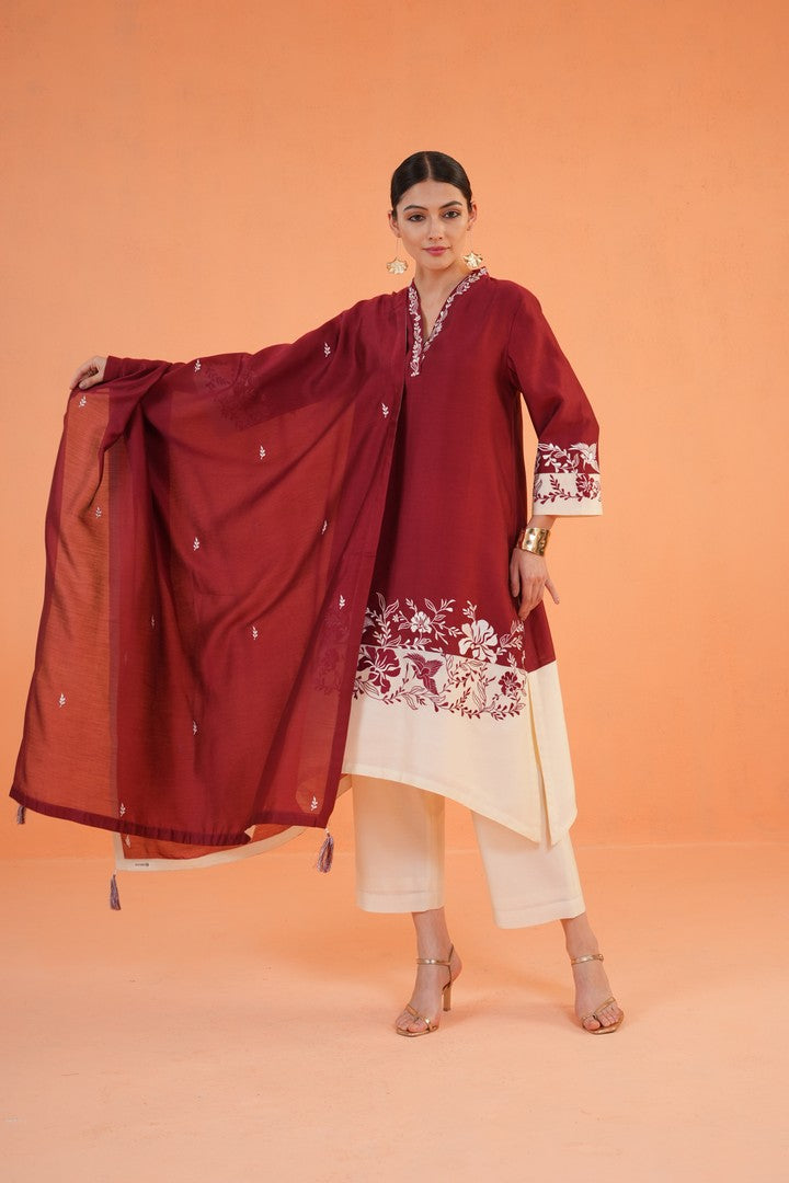 Maroon Chanderi Silk Embroidered Dupatta with Ivory border on reverse side and tassles in the dupatta corners